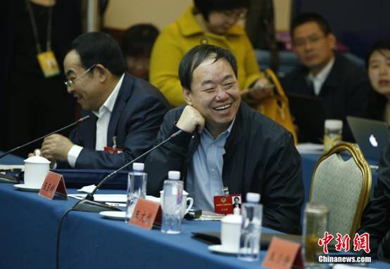 3月5日,全国政协十二届四次会议举行分组会议。左宗申(左)和王玉锁参加工商联讨论。中新社记者 张浩 摄