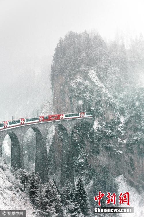 3月15日消息,瑞士,一列红色的火车冒雪从朗德瓦萨高架桥上驶过,仿佛童话里的场景。这座高架桥高65米,长136米,建造于1901-1902年间,如今仍在使用,是世界遗产地雷蒂亚铁路及沿线风景中的标志性建筑。