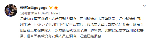 随后,辽篮跟队记者表示,球队总经理严晓明称:“赛后回到去酒店,四川球迷冲击辽篮队员,辽宁球迷和四川球迷发生冲突,辽宁球迷中有辽宁队家属,包括贺天举,郭艾伦的父亲,球员看到后就上前?;ぜ胰耍剿婧缶头⑸私徊匠逋?。此前辽篮要求四川加强安保,但今天赛后没有安保人员在酒店,辽篮已经报警?!?/p>