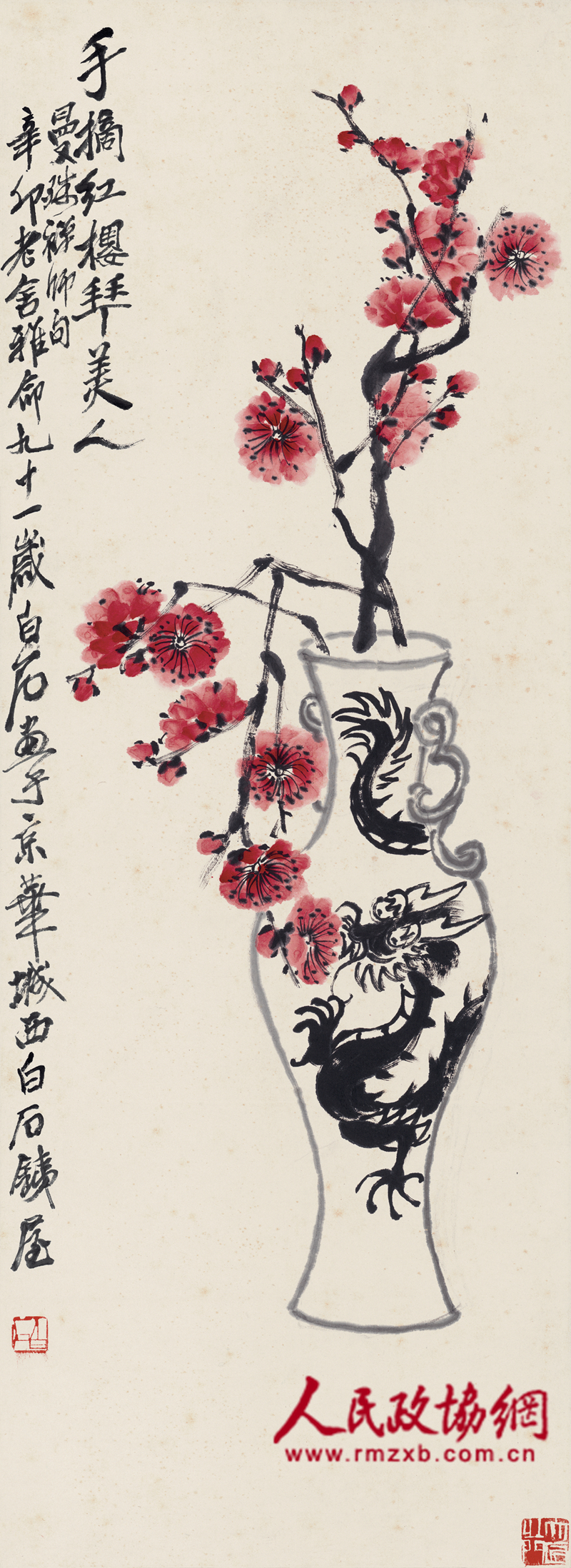 首先看《手摘红樱拜美人》??吹秸夥?,马上有人会说,这和美人有什么关系?表面上看,画面上确实没画什么美人,只是画了一束红?;ú逶诹嘶ㄆ恐校邢敢幌?,白石老人选用的这个瓷瓶可是有讲究的。老人刻意选用了中国陶瓷中典型的器型“美人瓶”来寓意美人,鲜花插在其中,瓶与花交相辉映,美人却在画外,不就是把鲜花献给了美人吗!这样一想,马上会觉得白石老人真不愧是一位造境高手。试想,如果画面上真是画了一位美人手捧鲜花站在那儿,那这幅画岂不是既俗气又直白,断然没有了诗的韵味。