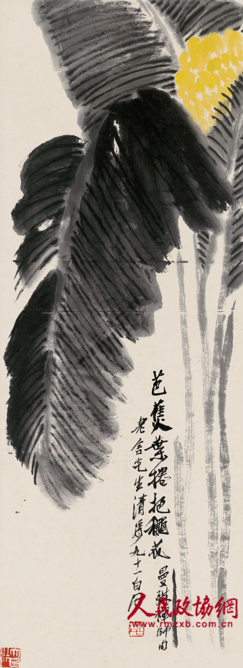 画这幅画时,白石老人还遇到了一点小麻烦,画芭蕉叶卷时老人记不起叶子是右卷还是左卷,他便让弟子为他去看一看实物??上?,找半天,北京冬天不长芭蕉,无奈只好放弃了画卷叶。通过这件小事也可以看出老人在艺术上的严谨。