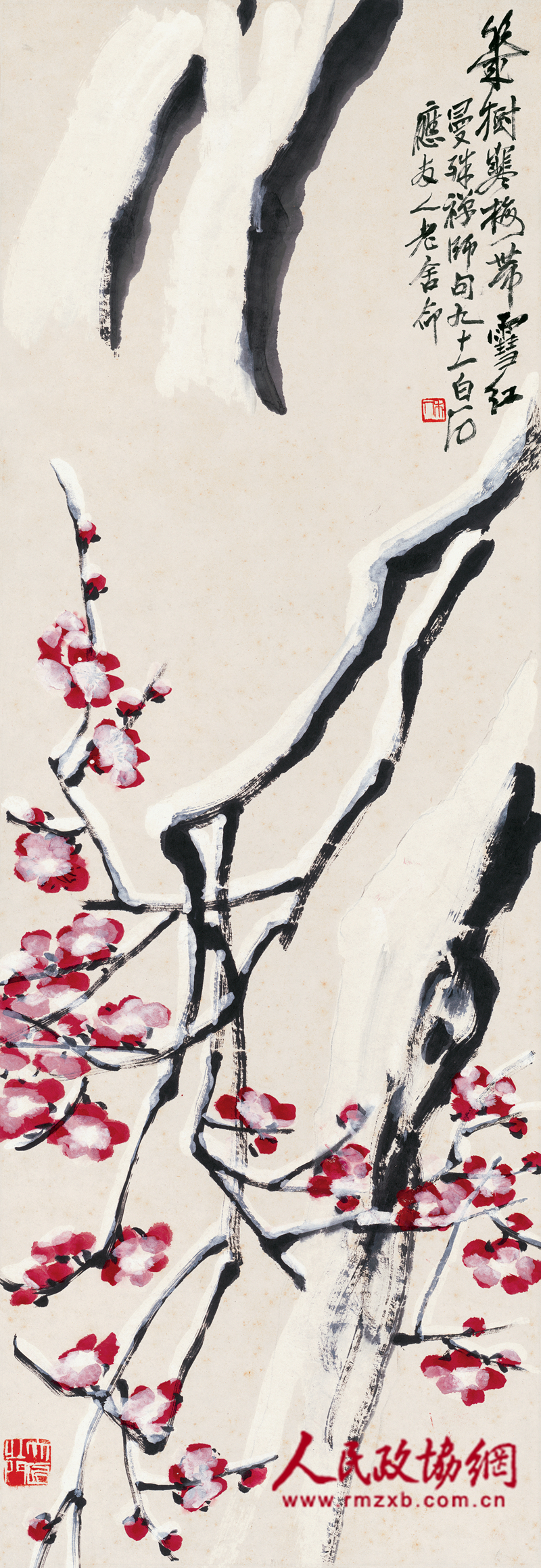 白粉是中国画颜料中的宠儿。在这幅画中,红梅在白雪的衬托下显得更加娇艳,而白雪也正因为有了红梅的陪伴才有了灵魂。白石老人用画笔很好地诠释了原诗的意味,又使诗意长长地绵延,留下了一幅梅雪相融互映的美好图卷。在这里,是梅“带”雪,还是雪“带”梅?早已共生共荣了。这也让人想起宋代诗人卢梅坡的《雪梅》诗:有梅无雪不精神,有雪无诗俗了人。日暮诗成天又雪,与梅并作十分春。