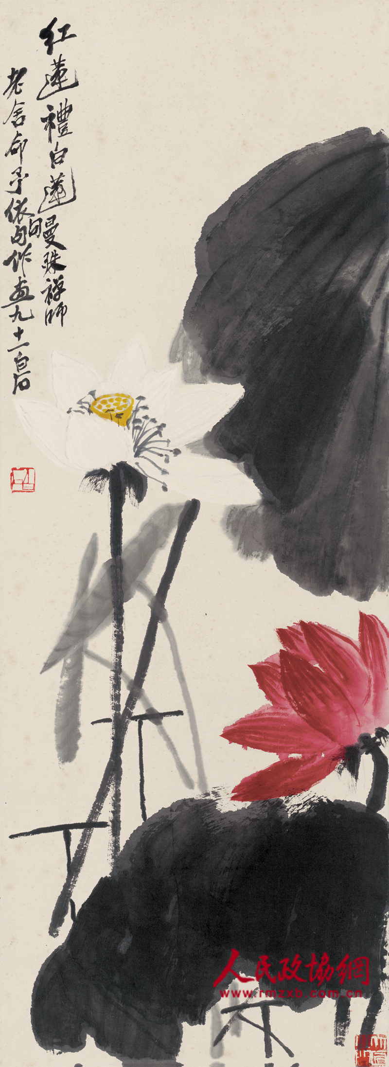这幅《红莲礼白莲》,关键在“礼”字上?;嫔习琢Π涡蕹?,高傲地昂着头,而红莲花朵似开未开,微微俯首,表现出一副含蓄谦恭的神态,两朵花之间施礼与受礼的关系一目了然。在这幅画中,还有个细节处理得耐人寻味:白石老人使白莲的一片花瓣微微下垂,像是对红莲施礼的回礼。这样处理不仅使两花之间有了情感呼应,也表现出了白莲贵而不骄、华而不傲的品性?;嫔鲜橇蕉浠?,但却又分明也是两个人。