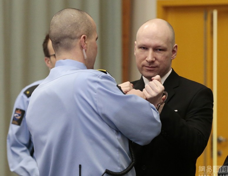 今年37岁的布雷维克指挪威政府长期把他单独拘禁,并对自己被关押的整体状况提出控诉,其中包括经常使用手铐。据了解,挪威监狱是出了名的豪华,里面电视、厨房、客厅、卫浴一应俱全。这样世外桃源般的监狱,依旧不能让布雷维克称心如意。布雷维克嫌弃牢里“咖啡太冷”、“面包没涂黄油”、“不能用润肤霜护肤”,此外,每天早上刷牙、刮胡子时间太赶、电视、电灯开关都设在牢房外,这些都让他感到不便。图为警察为其打开手铐。