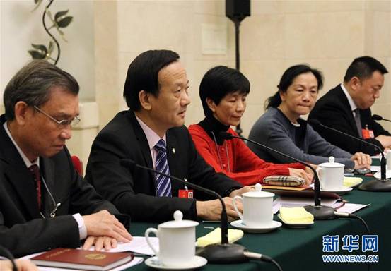 澳门代表团全国人大代表刘艺良(左二)说,“十三五”期间,澳门在“走出去”方面将大有作为,作为海上丝绸之路的重要节点,可以发挥商贸服务平台的作用。正在举行的全国两会上,来自香港、澳门和台湾的代表委员认真审议和讨论政府工作报告和“十三五”规划纲要草案,为国家的发展积极履职,建言献策。新华社记者刘卫兵摄