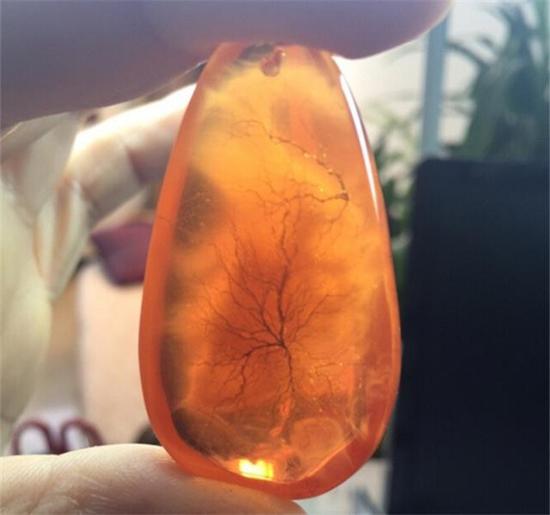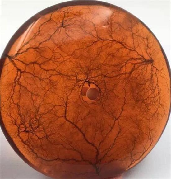 2:类似植物根系的内部纹路,是血蜜蜡的重要特性标志。在血蜜蜡形成过程中,在外力作用下不断产生裂隙,又在外力作用下完成二次填充,因此也就出现了非常独特别的根状包裹体, 那些树根一样的东西,自然舒展,肆意蔓延,显示出一种令人震撼的生命力!这种类似植物的根系力证其天然性!