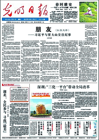2014年4月21日,《光明日报》头版头条刊登《朋友(纪实文学)——习近平与贾大山交往纪事》。