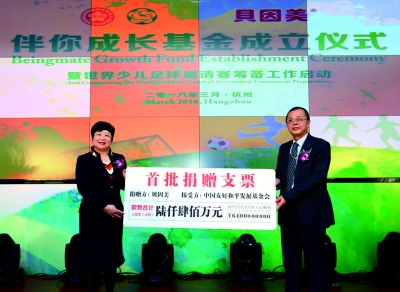 2016年3月2日,由中国友好和平发展基金会和贝因美共同发起的伴你成长基金成立仪式在杭州举行,双方达成长达十年的捐赠合作,首批捐赠款物合计6400万元,共同助力中国青少年足球事业的发展。