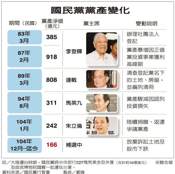 去年1月朱立伦接任党魁,党产还剩下242亿元,截至今年1月只有166亿元。据了解,在朱立伦任期内,国民党也捐赠或抛弃部分资产。