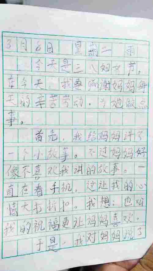 “今天是三八妇女节。在今天,我要感谢妈妈每天的辛苦劳动,为她做点事。首先,我给妈妈讲故事,不过妈妈好像不喜欢我讲的故事,一直在看手机。这让我的心情大打折扣。我想,也许我的祝福更让妈妈喜欢。于是,我对妈妈说了祝福,可妈妈依然看着手机,我更加伤心了。我想,这个办法也不行,我来给她捶背吧。我卖力地给妈妈捶背,可妈妈还是看着手机,脸上没有一丝笑容,我更伤心了……”