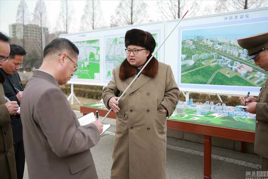图为朝鲜领导人金正恩站在建筑物模型前,指导和视察平壤建设情况。图/东方IC