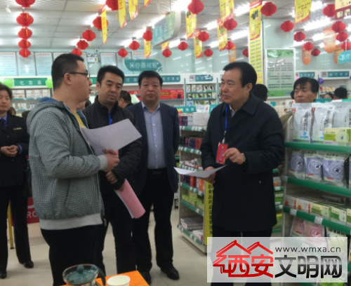 图为:县政协主席白安选(右一)、市场监管局局长王小勇(右二)查看药店
