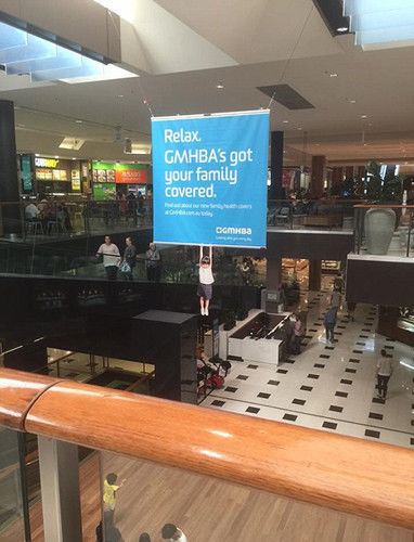 澳大利亚维州Geelong Westfield购物中心的一则保险公司广告近日吓到了不少顾客。广告横幅上写着“放轻松,GMHBA(保险公司名称)会照顾好你的家人”,而广告横幅的正下方竟然悬挂着一名“小女孩”。