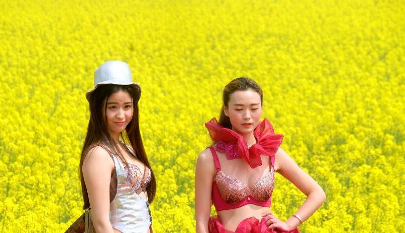 各种清凉装扮的模特在黄澄澄的油菜花海中走秀。