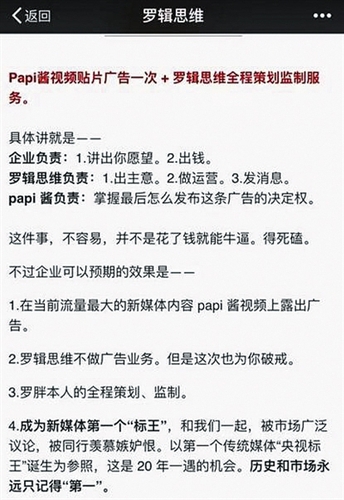 然而,Papi酱本身拍摄剪辑台词配音都具有一定难度,长期保持高水准的喜剧段子几乎是不可能的,即使可能,受众也很快会产生审美疲劳。这样不可复制的个人网红崛起,长期变现是难以为继的。所以,罗辑思维将Papi酱的广告资源变成了一次招标沟通会。
