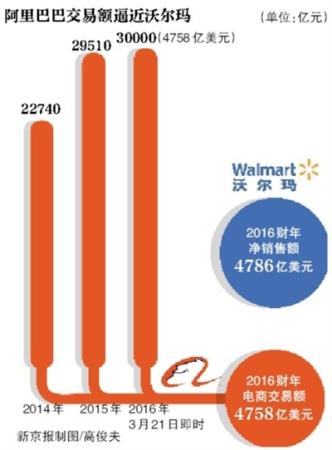 新京报记者查询沃尔玛财报发现,在沃尔玛2016财年当中(截至2016年1月31日)不计入会员和其他收入的交易额有4786.14亿美元,的确被阿里巴巴的3万亿元人民币(约合4632亿美元)逼近。