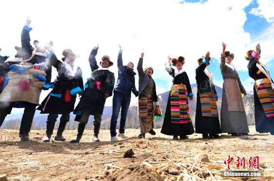 3月16日,拉萨市堆龙德庆县古荣乡加入村村民在春耕仪式上抛洒青稞面祈福。当日是藏历元月26,根据藏族天文历算,当日是一个适合春耕春播的良辰吉日,西藏多地农牧民按照延续数百年的传统,纷纷以不同形式举行春耕仪式。 中新社发 唐朝杨 摄