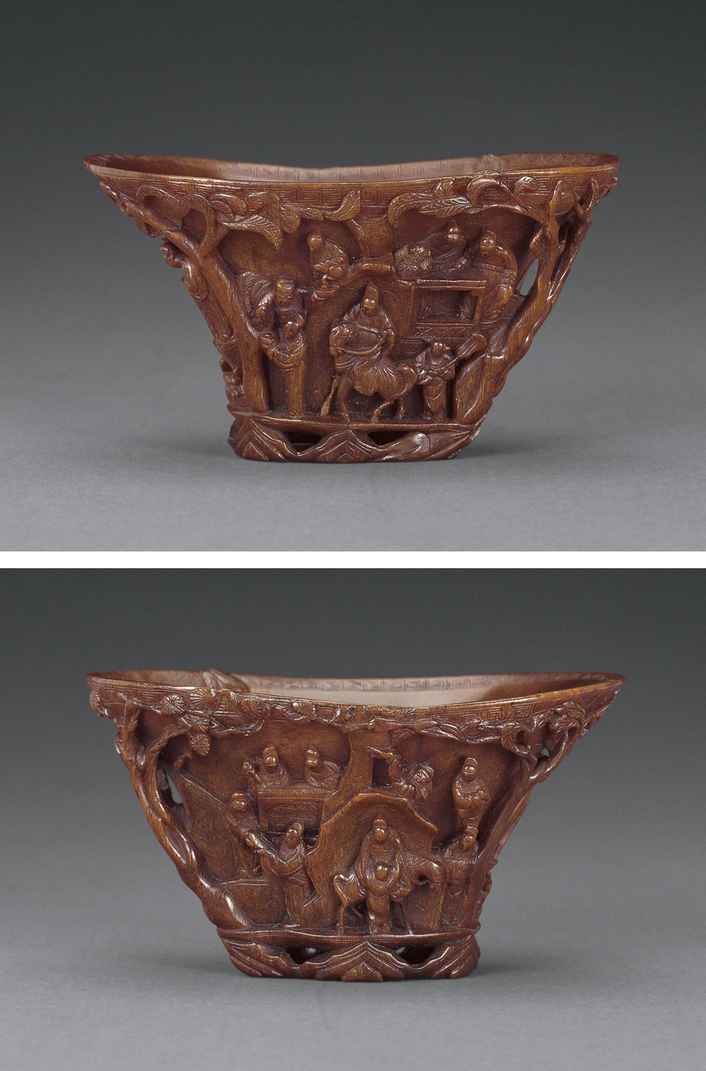 我朋友收藏了一件清早期犀角雕十八学士图杯,它长17.8厘米,以竹石芭蕉为背景,人物或抚琴对弈,或书法作画,神态安详,悠闲自得。