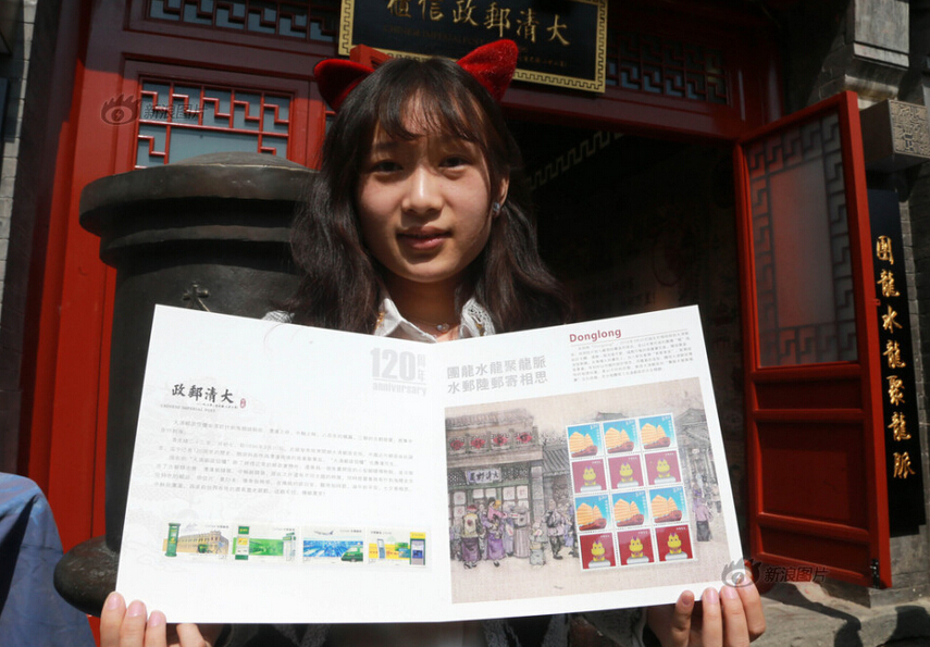 2016年03月20日,北京,因装修停业一个多月的大清邮政信柜在什刹海烟袋斜街重张开业。重张后的信柜除保留原有邮政业务外,还新增邮驿博物馆,为游客呈现从商周时期到清代的邮驿发展历程。集邮爱好者展示新发行的《中国邮政开办一百二十周年》纪念邮票1套4枚。