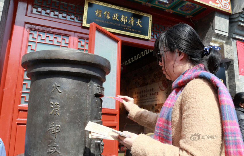 2016年03月20日,北京,因装修停业一个多月的大清邮政信柜在什刹海烟袋斜街重张开业。重张后的信柜除保留原有邮政业务外,还新增邮驿博物馆,为游客呈现从商周时期到清代的邮驿发展历程。游客在大清邮政信柜门前投寄明信片。