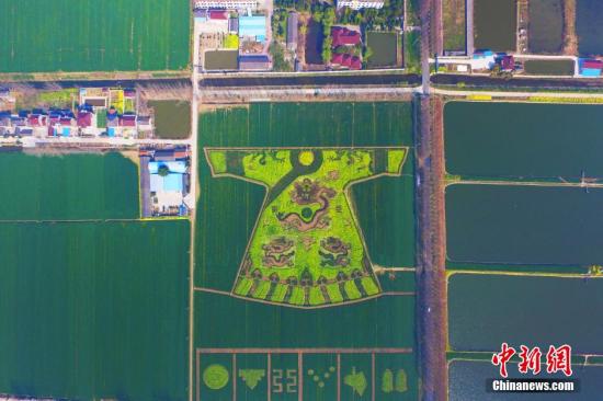 在这幅“大地画”旁边,还有一幅更为巨大的“二龙戏珠”迷宫图,占地约140亩,以绿色的麦田和黄色的田地相隔打造了一个游人可以走入的“迷宫”。