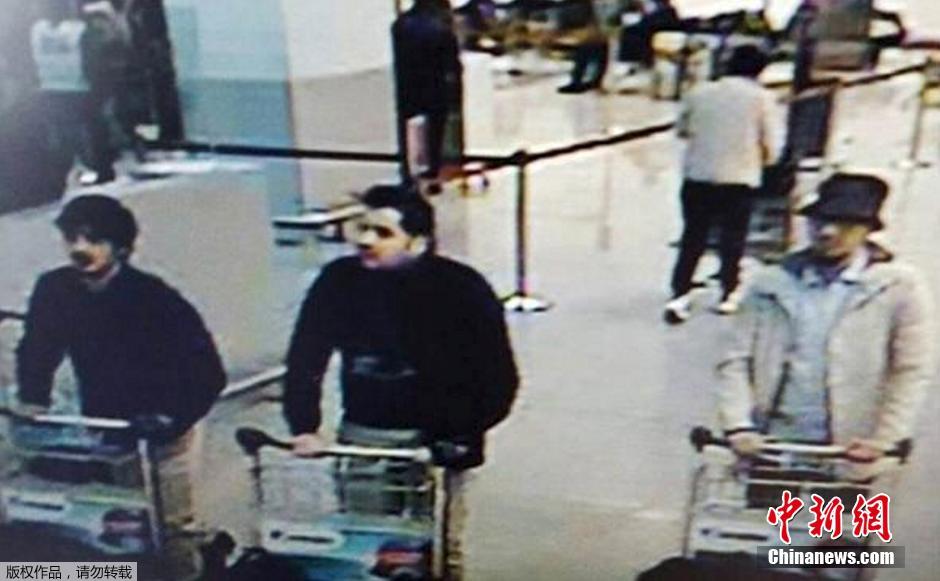当地时间2016年3月22日消息,比利时联邦警察公布一张机场监控拍摄下的三名机场恐袭嫌疑犯的视频截图。