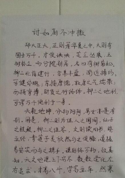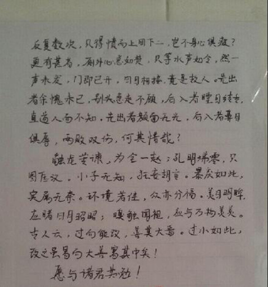 近日,因为一篇长达790字、贴在女厕所里的《讨如厕不冲檄》,让郑州某大学大二女生高子倩突然成为“网红”?!梆⑾轮谏袷窒讼?,轻按一钮,并不损其玉质冰洁,而使环境优美,居者欢欣……”,明明是在劝人在如厕后自觉冲厕所,却也写得文采斐然。此文经微博、媒体传播后,获得不少网友的肯定和支持,对高子倩的才思以及另辟蹊径劝阻不文明行为的方式点赞。(3月22日《大河报》)