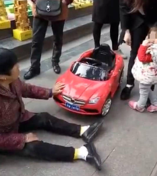 2016年3月23日报道,网曝一名小女孩开玩具汽车不小心撞到一名老人,结果老人坐在地上倒地不起。