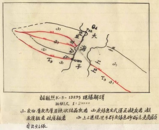 大海子石灰岩矿平面地质草图。(据航照K-5-13295现场解译)作者的地质笔记和他参与绘制的区域地质图,字迹清秀工整,图幅线条清晰。