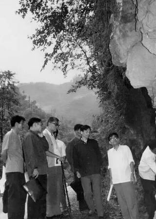 1983年8月,随孙大光(左三)在四川考察时观察峨眉龙泉洞三叠系剖面