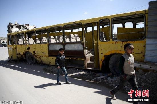 儿童们从大马士革的一辆满身弹孔的大巴旁经过。在战火中,他们成了最直接最无辜的受害者。国际慈善机构“救助儿童会”数据显示,截至今年3月份,大约25万叙利亚儿童生活在围困之中,不少孩子成为战争孤儿,一些人只能吃动物饲料充饥。