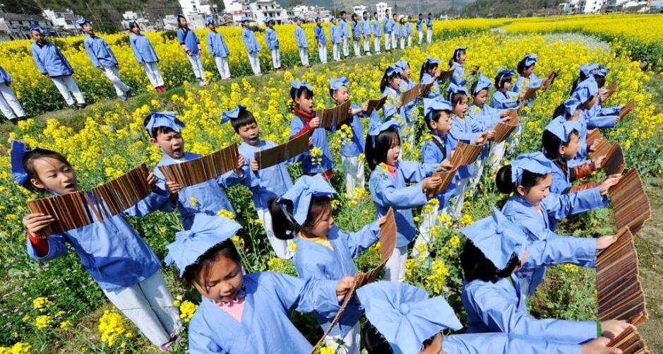 2016年3月25日,江西省上饶市,当天,江西省婺源县溪头龙尾小学4年级的近50名学童身穿古装,在老师的指导下走出校园,来到中国四大花海之一的该县江岭万亩梯田油菜花海中,开展“穿古装、诵国学”活动,让同学们感触传统文化魅力、弘扬经典文学的同时,使我国传统文化与自然得到有机结合,呈现出人花相融、天人合一的美丽景象。