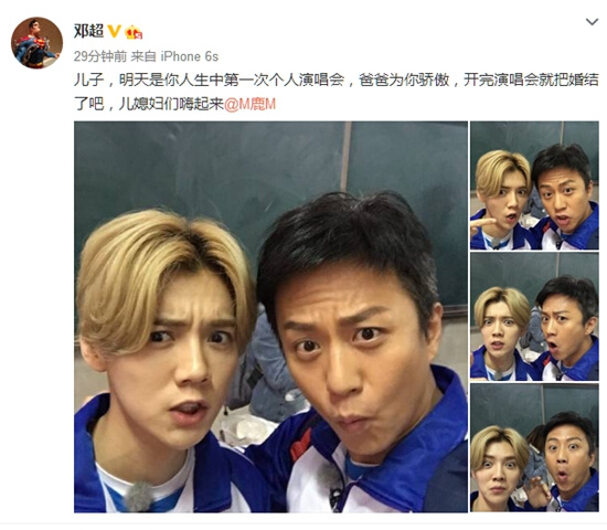 今日,邓超在微博晒出与鹿晗调皮合影,同时留言称,“儿子,明天是你人生中第一次个人演唱会,爸爸为你骄傲,开完演唱会就把婚结了吧,儿媳妇们嗨起来”。照片中,二人身穿学生装,皱眉对嘴,模样搞笑。