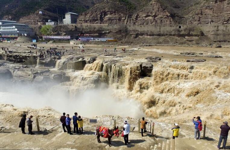 2016年3月26日,山西临汾,受气温回暖和上游融冰开河影响,位于山西吉县和陕西宜川县交界的黄河壶口瀑布迎来一年一度的 “桃花汛”。壶口瀑布水量骤增,每秒流量达到2200立方米,形成壮美瀑布群,吸引了众多游客。 “桃花汛”是指每年三月下旬到四月上旬,黄河内蒙古段冰凌消融形成春汛。当其流至下游时,由于恰逢沿岸山桃花盛开,故被称为“桃花汛”。