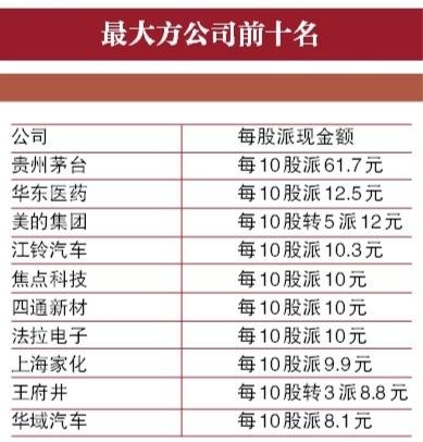 截至目前,贵州茅台、华东医药和美的集团分别以每10股派61.71元、每10股派12.5元和每10股派12元的分红水平,分列两市公司现金分红的前三名。