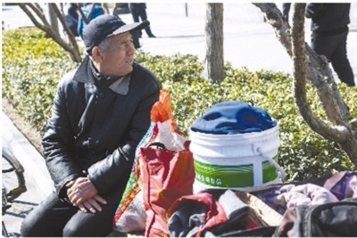 3月16日,上午9时,务工者自发形成的虎坊桥马路劳务市场里,求职的人摩肩接踵。他们拖着行李、提着桶、带着馒头和干粮,四处张望招工人的身影,一看穿着干净、得体的人走近,赶忙凑上前去将其团团围?。骸靶枰寺??”