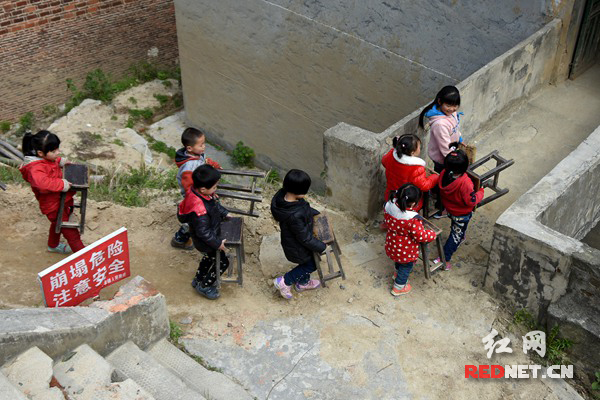 孩子们搬着凳子高兴地回到学校。