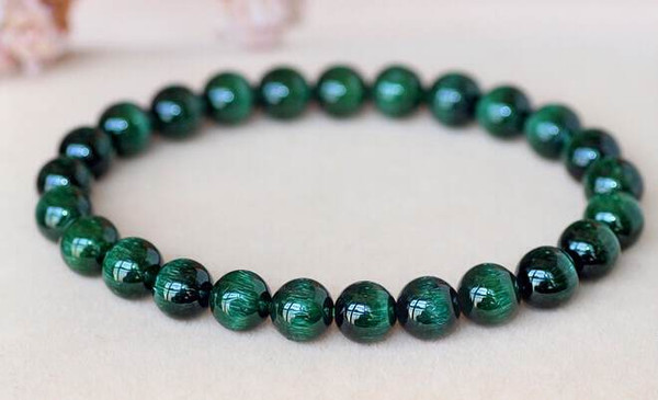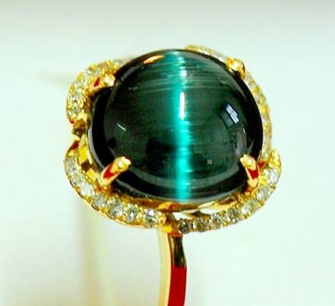 碧玺的猫眼效果是因为碧玺内部有平行的管状包裹体,这种包裹体达到一定密度,在垂直平行包裹体的方向在光源照射下就会有一条亮线,这样的碧玺原料切磨出来才会有猫眼效果。