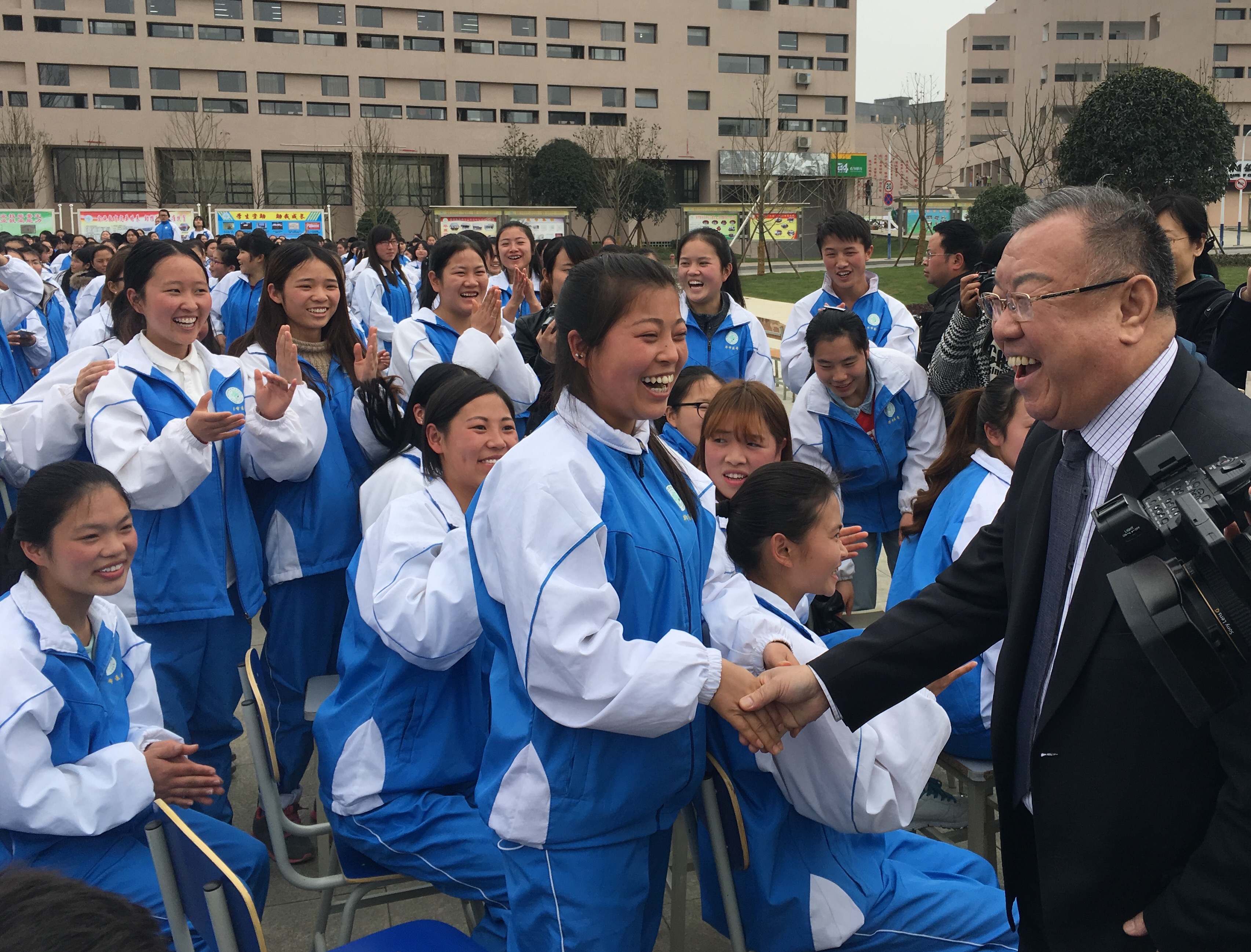 李文忠与毕节医专的同学们热情互动。