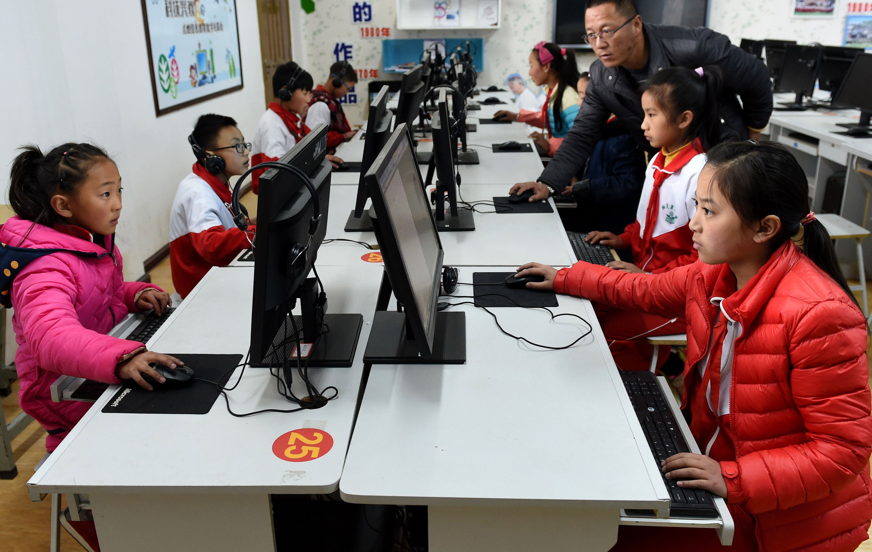 迪庆藏族自治州香格里拉市建塘镇独克宗小学学生在上计算机课。