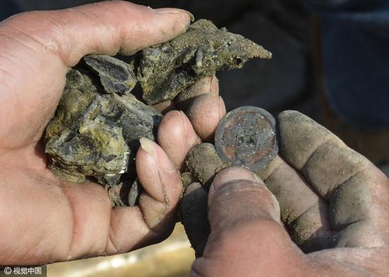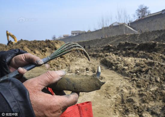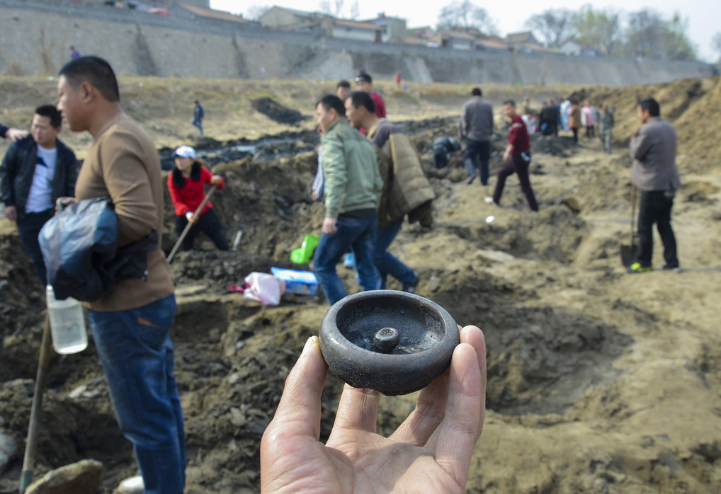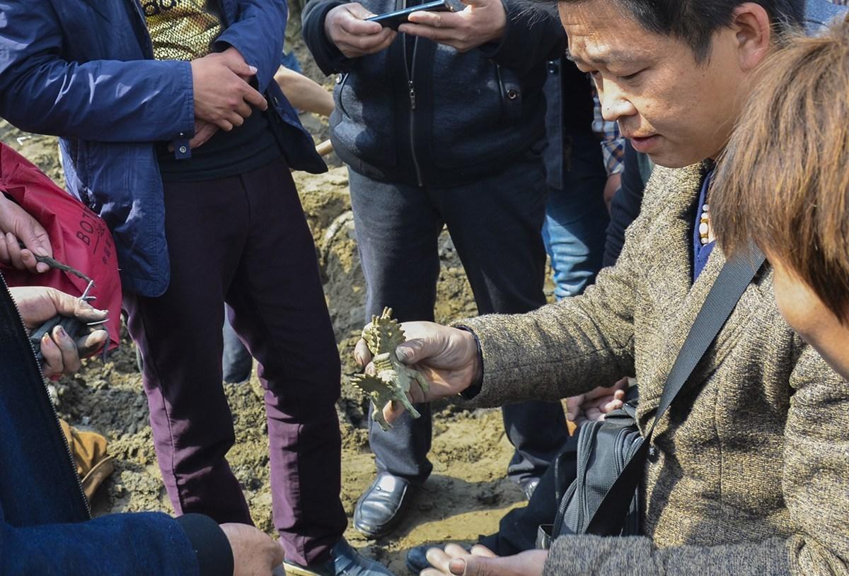 2016年3月31日,中国大运河河南滑县段(现称卫河)断流清淤,文物收藏爱好者在挖宝现场买到的铜麒麟。