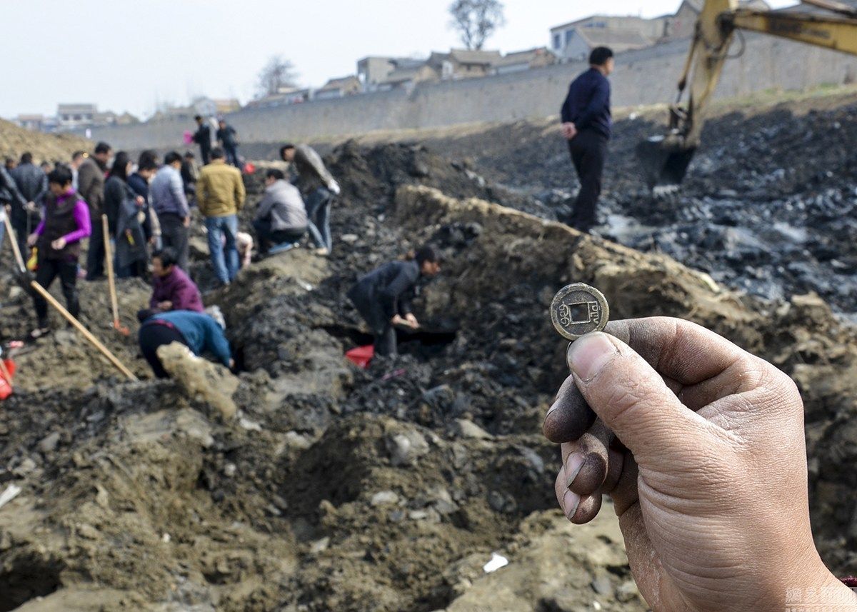 近日,大运河河南滑县段(现称卫河)断流清淤,有村民在河底挖出铜麒麟、金元宝、古代铜钱、簪子、古钗、陶器等文物。消息传开,引来更多附近的村民前来挖宝。