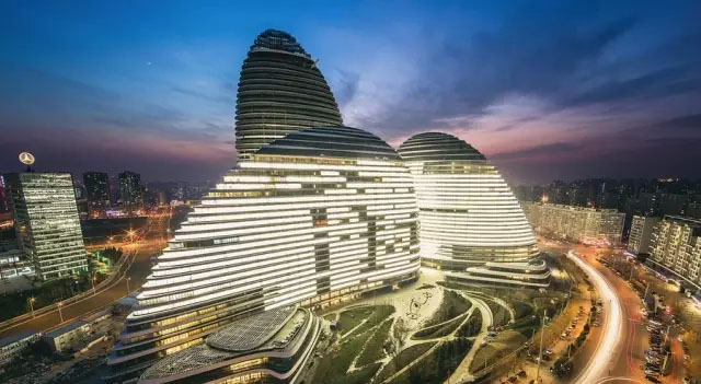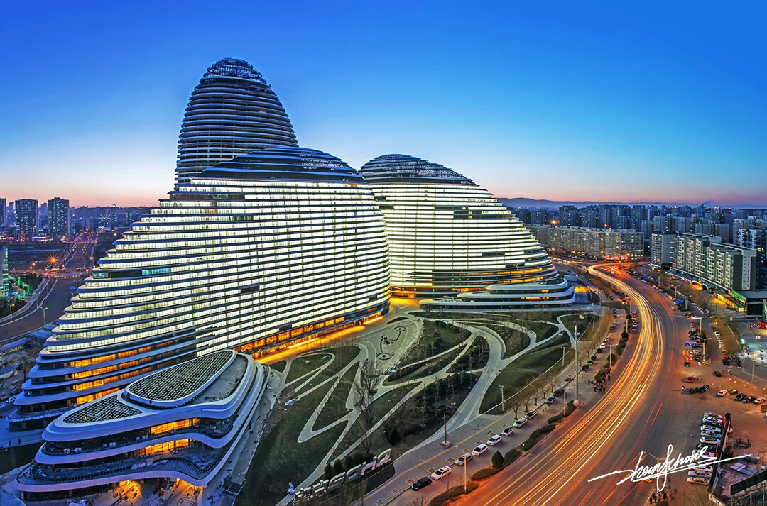 哈迪德设计的北京银河SOHO在设计策略上,通过单体的整合营造出一个壮观的整体。每栋建筑个体均有它的中庭和交通核心,且在不同层面上融合一起,从而创造出丰富流动的空间景致和室外平台。而哈迪德受自然的启迪,建筑的外观展示了连续流动的深空间。