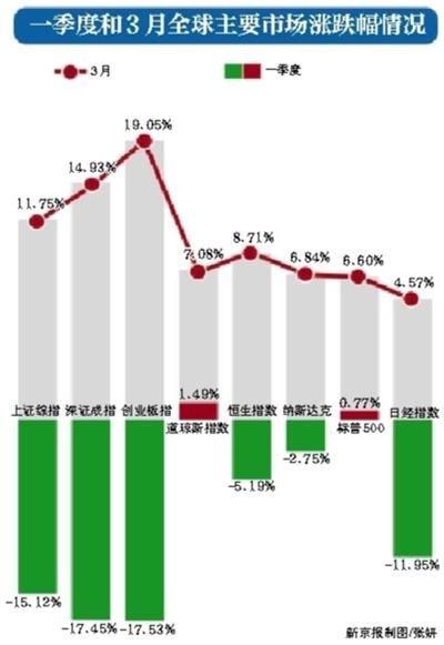 2016年第一季度,上证综指、深证成指、创业板指分别以15.12%、17.45%和17.53%的跌幅熊冠全球市场。而在三月单月,上证综指、深证成指、创业板指分别大涨11.75%,14.93%和19.05%,高居全球主要市场前列。