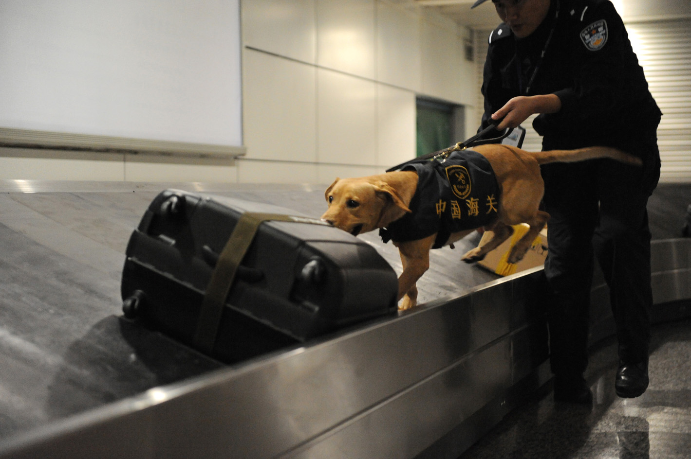 缉私犬队的带犬警员迅速作出反应,他轻轻敲打行李箱让濒危物种搜查犬进行嗅闻检查。这只特种搜查犬认真嗅闻后,突然在行李箱边坐下,这是“有料”的标准动作。