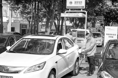 3月18日,一辆国产新能源电动汽车的车主在使用国网重庆市电力公司的充电桩为汽车充电。新华社记者 刘潺摄