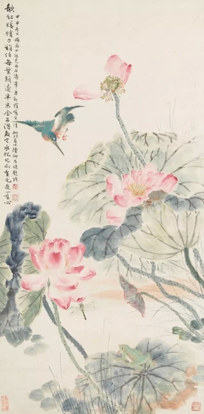 陆抑非 荷花翠鸟 纸本立轴 尺寸:105.5×52.5cm