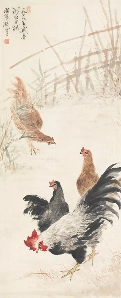 关山月 群鸡图 纸本镜心 尺寸:127×52.5cm
