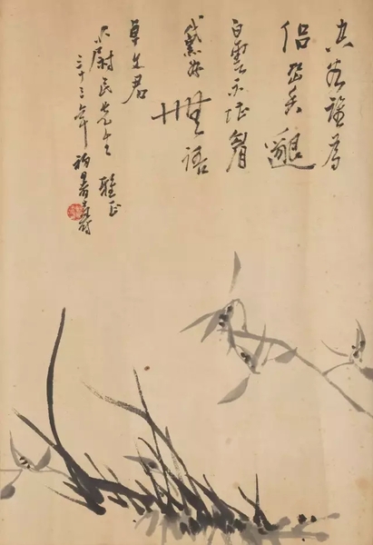 “幽兰生前庭,含熏待清风。”兰花恬淡素雅,高傲孤洁,一向为文人所爱?;锌钍裘窆辏?944),其时正是潘天寿绘画的风格形成之期。画中兰花蔓草潇洒润秀,婀娜多姿。挺拔的笔势与纵逸的情意,表现出兰花清逸出尘的独特气质?;猩峡钊讼粑得裣壬窆保剿叵埠檬榛鹗?,抗战时期萧蔚民调任中央通讯总社采访部主任,与诸多艺专教员相识过从。1944年潘天寿出任国立艺专校长,吴茀之亦至重庆,此作便于当年赠以萧蔚民先生。兰花白莲,多年辗转,三人心情寄语,由此可见一斑。