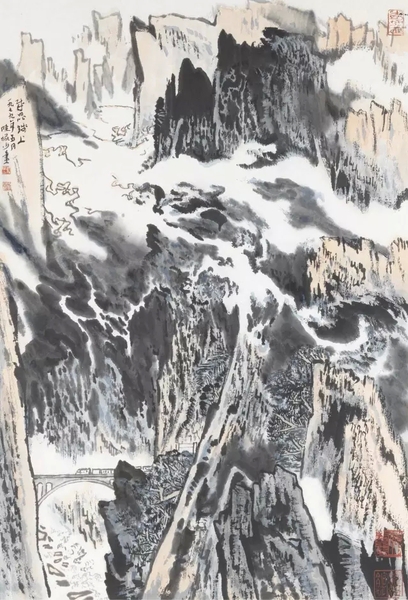 陆俨少“爱新就新”,写下了不少反映新社会、新事物的作品,现代化建设亦是主题之一。如中国铁路主要干线之一的成昆铁路即其显例。本幅所写正是列车穿出隧道,跨越悬空横架桥梁上的行驶过程中。画面构图严峻,中有云气如带来练飘绕,益显地势高峭。下方层岩积迭,紧密扣连,无形中强调了开盘铁路工程危阴之钜,布局用心之细致,足见画家倾力而成之。
